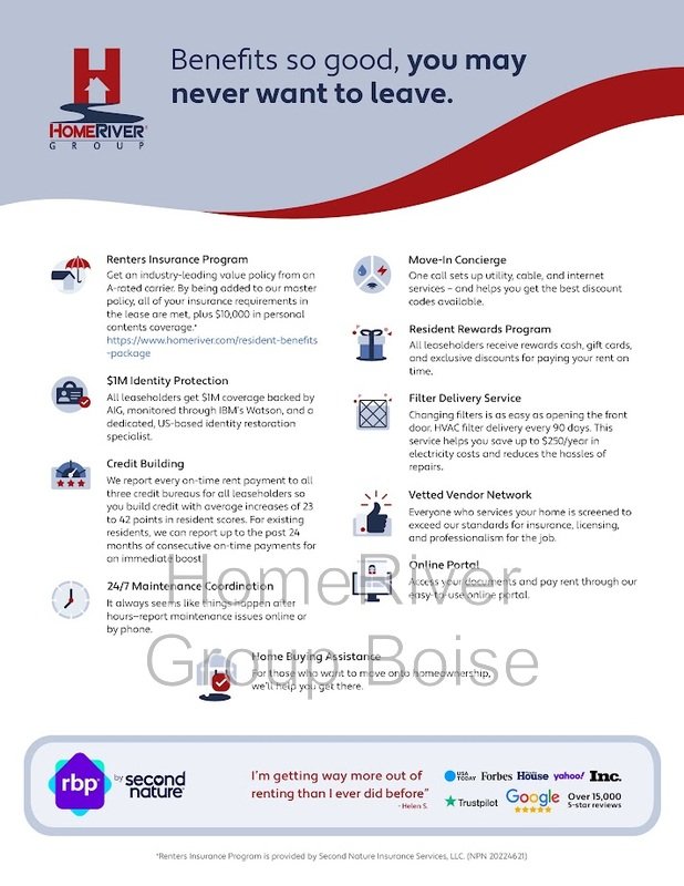 *The estimated total monthly leasing price does not include utilities or optional/conditional fees, such as: pet, utility service, and security deposit waiver fees. Our Resident Benefits Package includes required Renters Insurance, Utility Service Set-Up, Identity Theft Protection, Resident Rewards, HVAC air filter delivery (where applicable), and Credit Building, all at the additional monthly cost shown above. To learn more about additional leasing fees and requirements, please contact HomeRiver Group at 208-261-7070 .
